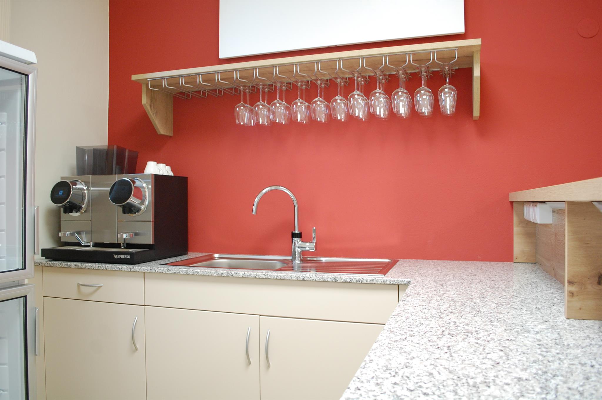 Es stehen ein Kaffeevollautomat von Nespresso, Getränkekühler und ein Rednerpult sowie sämtliches Geschirr zur Verfügung.